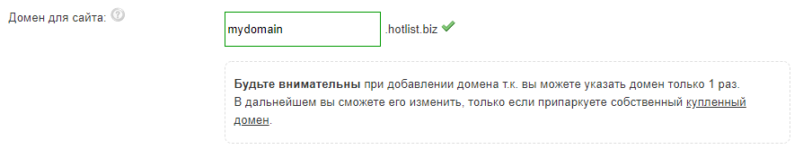 Для начала, что бы создать ваш сайт, нужно зарегистрироваться, заполнить данные о вас, и обязательно указать домен. Вы сможете либо припарковать ваш собственный домен по запросу, или подключить бесплатно домен в поле "Домен для сайта".