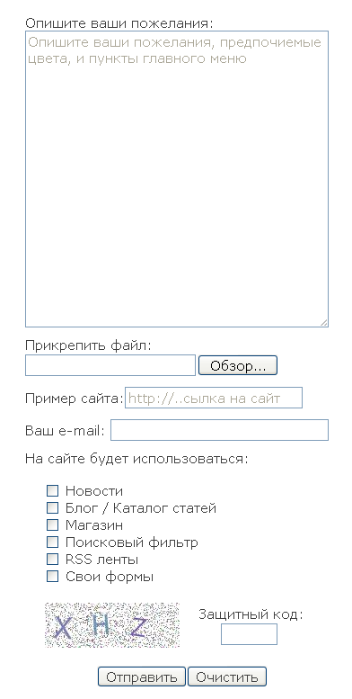 Например, можно создать форму для заказа сайта с указанием обязательных для заполнения полей: