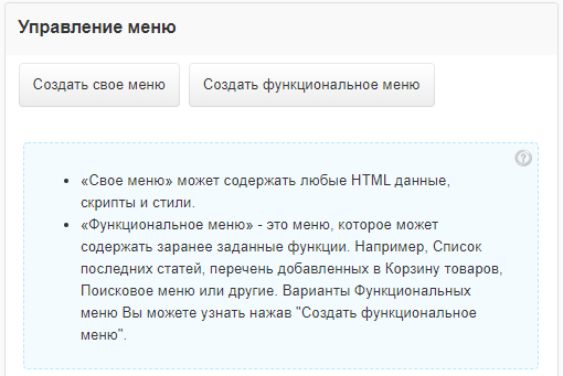 Выберите тип создаваемого меню. Функциональное меню - это меню с заранее заданными функциями. Свое меню - меню с вашими данными.