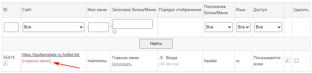 В списке ваших меню выберите меню помеченное как "главное меню".