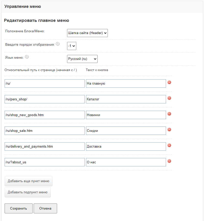 Вы сможете указать положение меню, а также страницы на которых его отображать или скрывать. Кроме стандартного положение внутри контента, вы можете расположить меню в шапке или футере (низу) сайта.