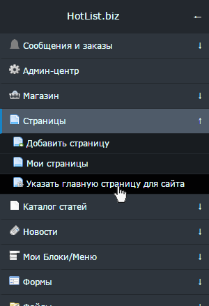 Теперь укажем ее в качестве главной страницы. Для этого откройте "Админ-панель" - "Страницы" - "Указать главную страницу для сайта".
