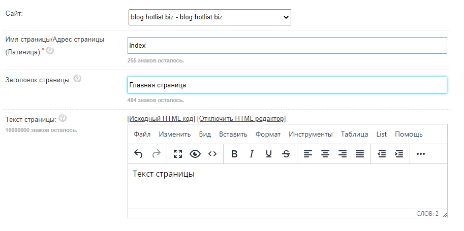 Index - в будущем будет адресом страницы, с приставкой .htm, т.е. например, если вы создаете страницу с именем "name", то для ее открытия достаточно ввести /name.htm после адреса вашего сайта.