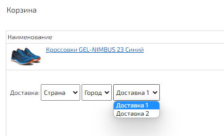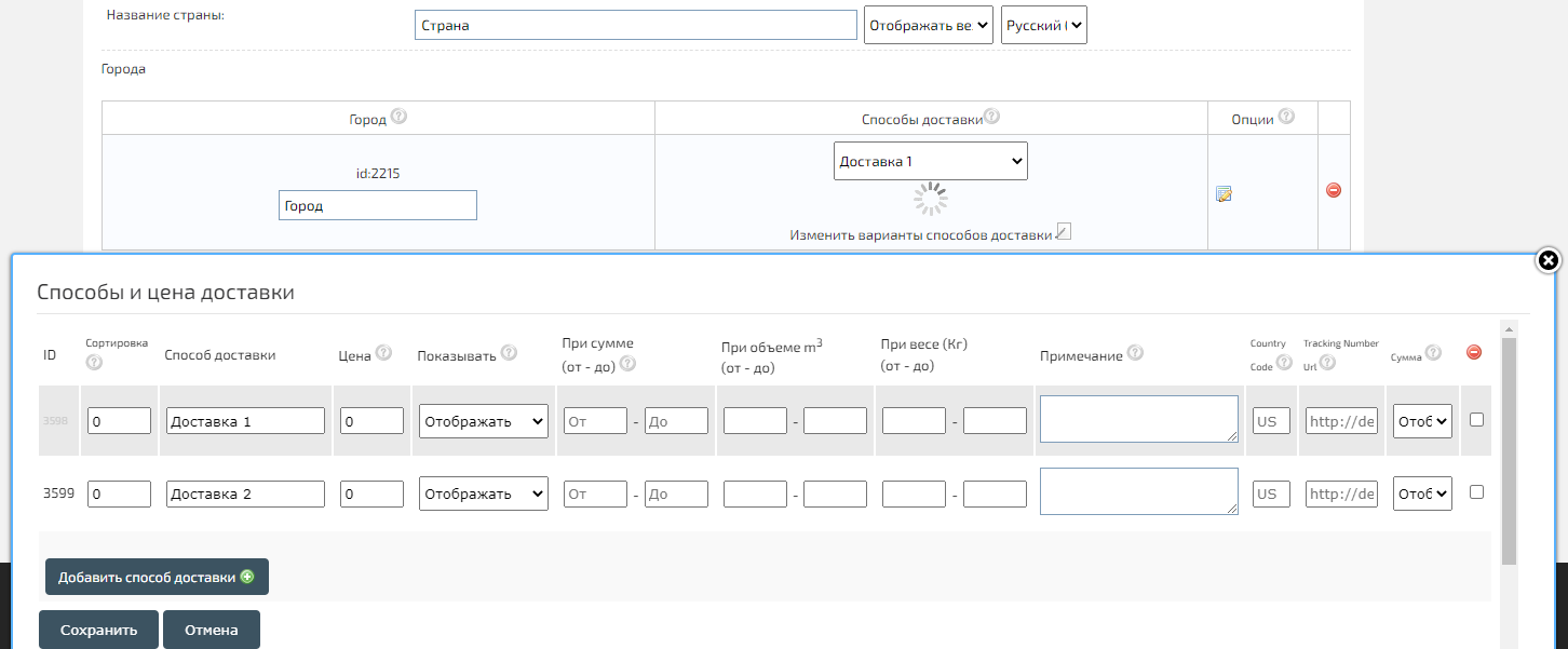 Указав страну, добавьте города и сохраните изменения. После этого вы сможете задать значения (список возможных способов доставки).