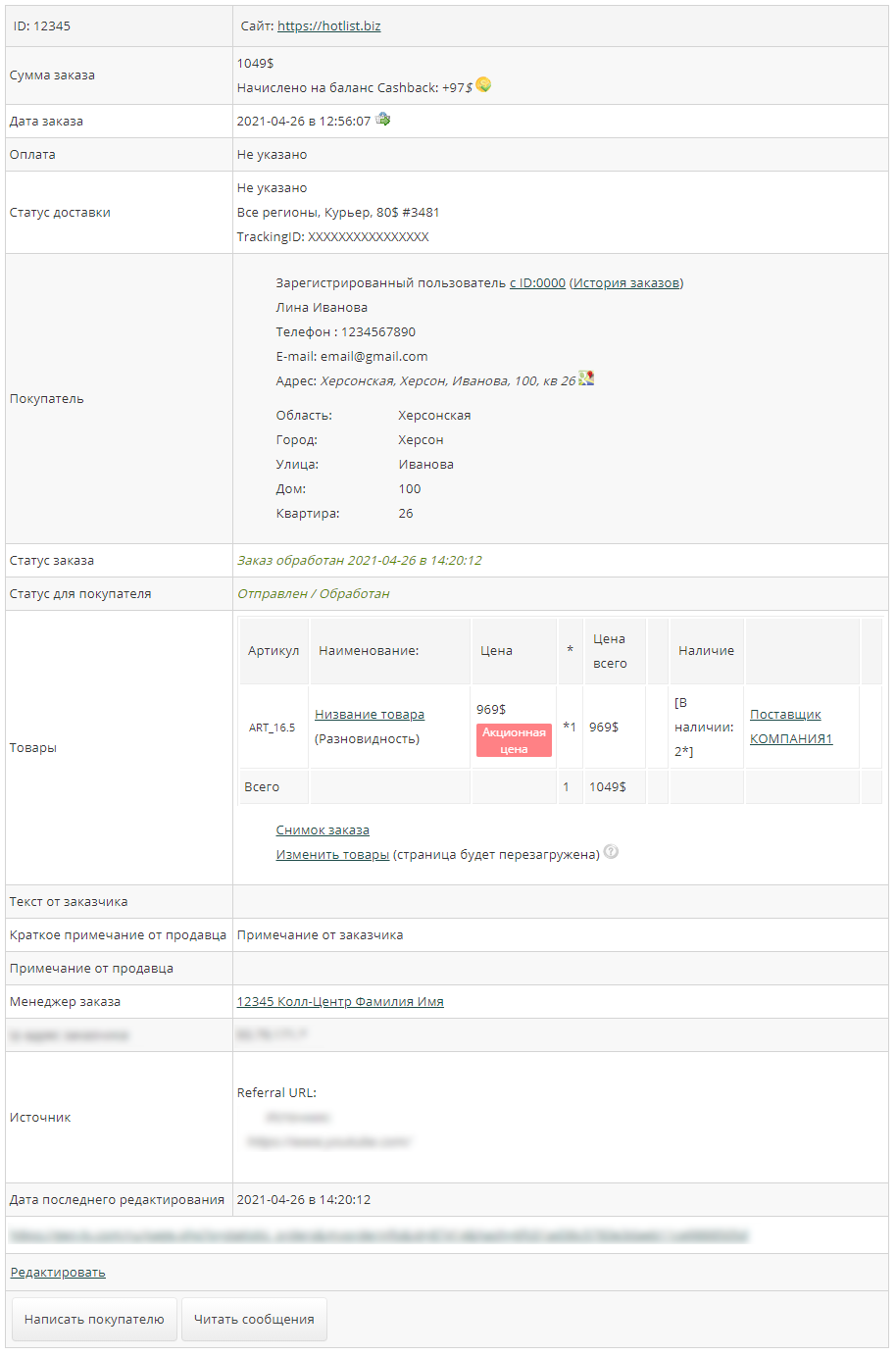 После оформления заказа, Вы сможете установить TrackNo и ссылку для отслеживания посылки. К каждому способу доставки Вы также сможете установить автоматическое заполнение ссылки для отслеживания посылки.