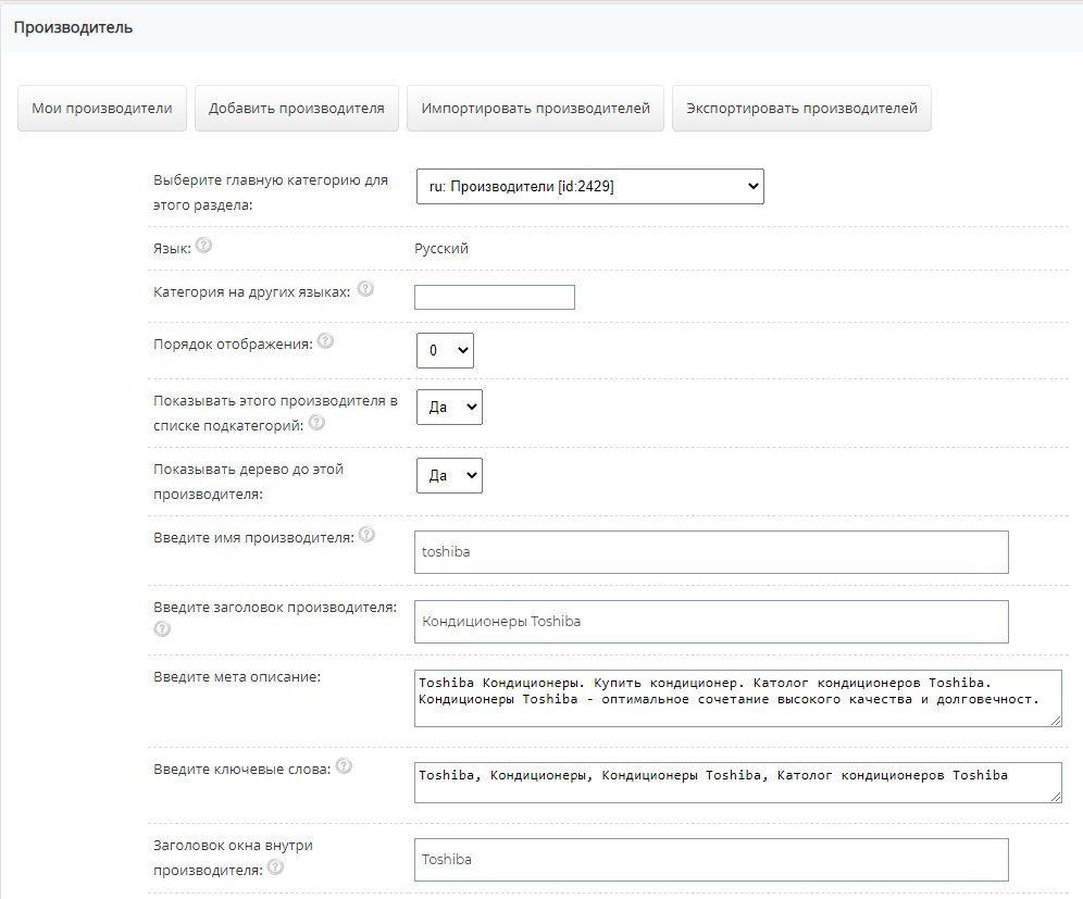 После того как Вы укажете производителя для товара, он может быть отображен в описании товара.