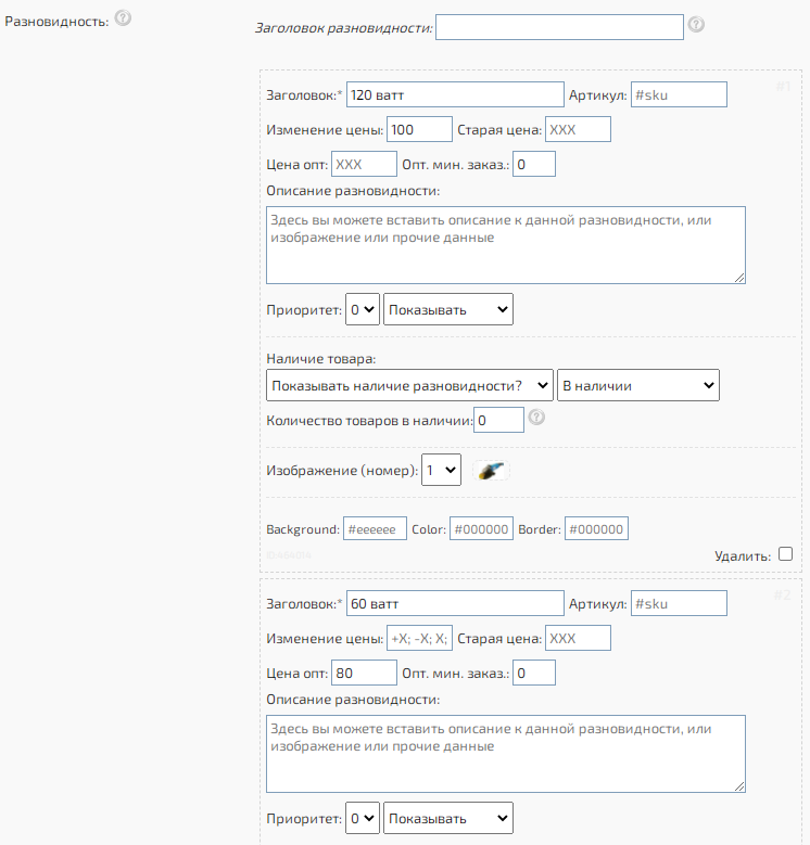 Вы можете установить к вашим товарам большой набор разновидностей. В разновидности можно указать любые параметры, вставить изображения и указать параметры изменения цены. К каждому товару можно использовать собственные значения. При добавлении товара, в строке "Разновидность", укажите название разновидности, цену и другие параметры.