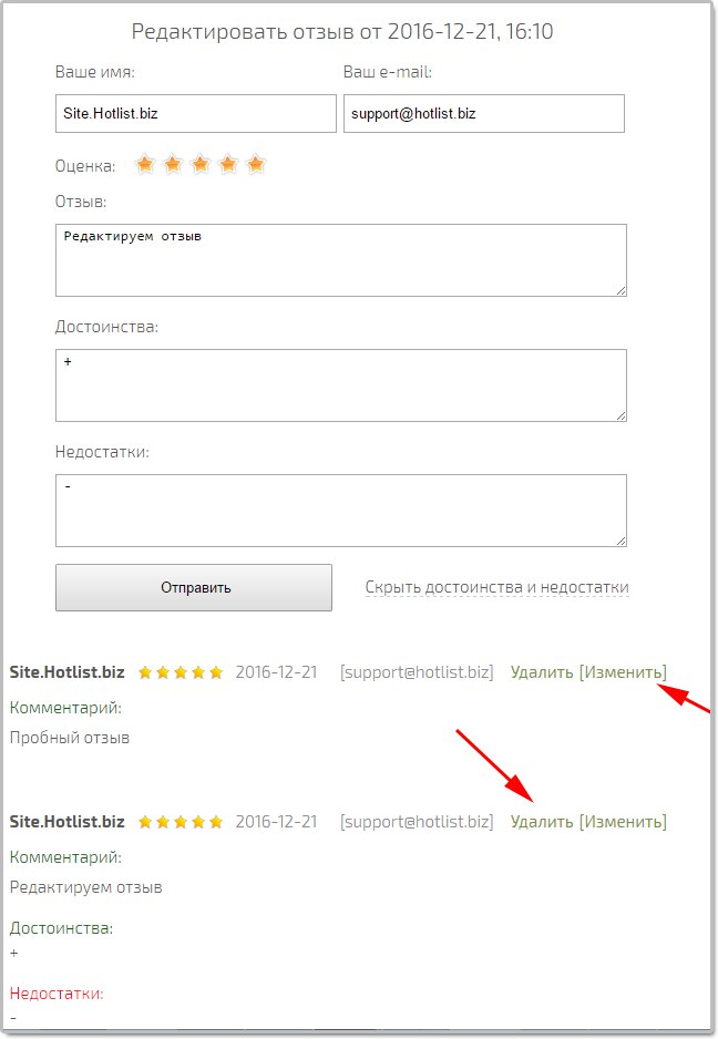 Додано редагування та видалення відгуків. Редагувати та видаляти відгук може автор (якщо не зареєстрований, то протягом години), а також власник або зареєстрований користувач.
