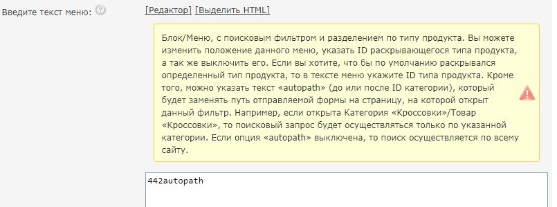 Додано параметр "autopath" для меню з пошуковим фільтром. Ця опція автоматично замінюватиме шлях під час пошукового запиту. Таким чином, якщо Пошуковий фільтр розміщено на сторінці конкретної категорії, пошук буде здійснювати тільки в цій категорії. Крім того, на сторінці управління Блоками/Меню додано додатковий опис функціональних меню.