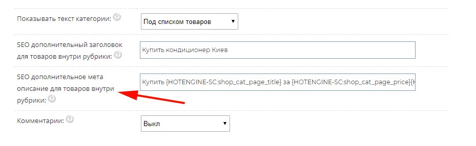 Реалізовано додаткову мета опис для товарів усередині рубрики. Це додає можливість автоматичного заповнення Мета опису в картці товару. Наприклад, якщо ваша рубрика "Смартфони", то ви можете використовувати списки автозаміни, з найменуванням товару та заповнити додаткову мета опис категорії так: "Купити смартфон {HOTENGINE-SC:shop_cat_page_title} за {HOTENGINE-SC: shop_cat_page_price}{HOTENGINE-SC:shop_cat_page_currency} Безкоштовна доставка.". При цьому мета опис в товарі даної категорії тепер можна залишити порожнім.