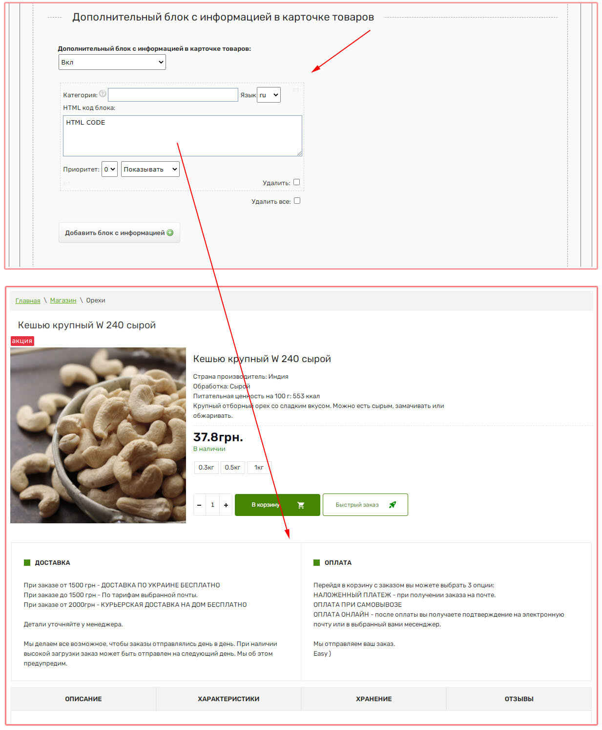 Доданий додатковий блок у Картки товару, який можна відображати з урахуванням "Мова" або "Категорії". Блок можна створити у розділі "Налаштування" - "Магазин", у вкладці "Перегляд товару/Вкладки/Різновид".