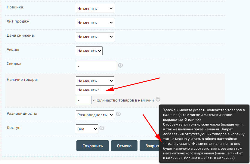 Оновлено Груповий редактор. Додано автоматичну зміну наявності при використанні математичного вираження зміни кількості товарів. При вказанні значення, наприклад "-10", якщо підсумкова кількість товарів менша за "0", то буде встановлено значення "Немає в наявності". Функція активна лише у випадку, якщо не вказано примусове змінення статусу наявності.