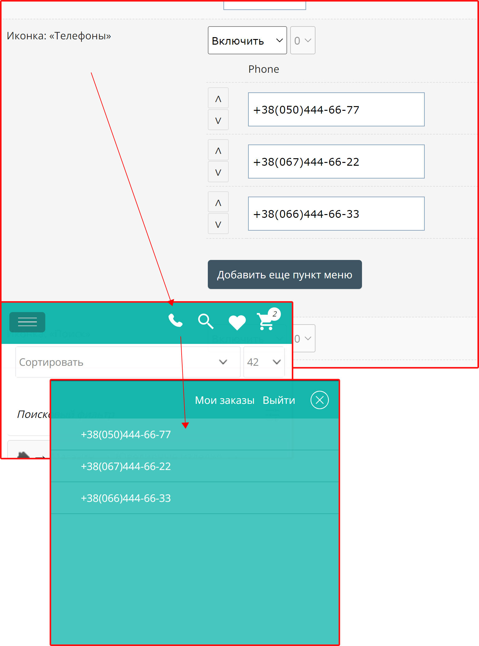 Додана кнопка Телефони для мобільного меню.